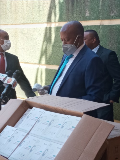 በሆቴልና ኢንደስትሪ ላይ የተሰማሩት አቶ አይሸሹም ተካ ዛሬ 200 የሰውነት ሙቀት መለከያዎችን ከጓደኞቻቸው ጋር በመቀናጀት ከውጭ አስመጥተው ለዘጠኙ የክልልየጤና ቢሮ ተወካዮች ዛሬ አሰረክበዋል።