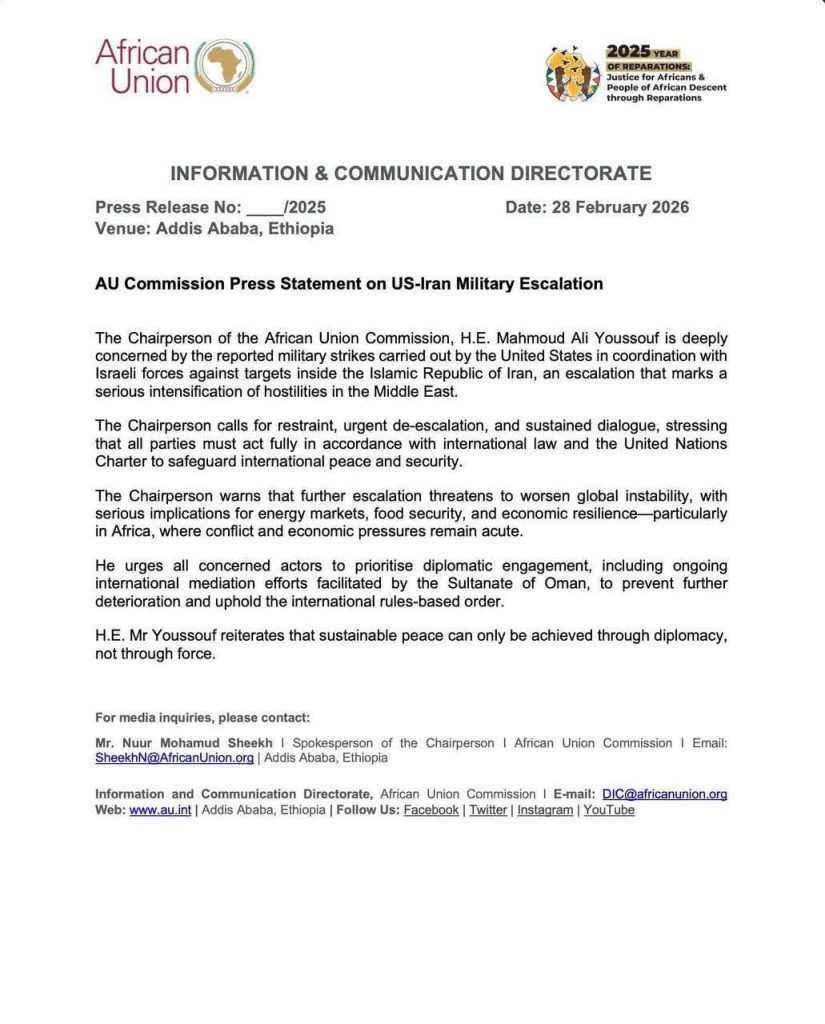 The African Union (AU) has entered the diplomatic fray regarding the escalating crisis in the Middle East, issuing a stern warning about the global economic and security implications of recent military actions. In an official statement released today, February 28, 2026, the Chairperson of the African Union Commission, Mahmoud Ali Youssouf, expressed “profound concern” following coordinated military strikes by United States and Israeli forces against nuclear facilities and strategic targets within the Islamic Republic of Iran.