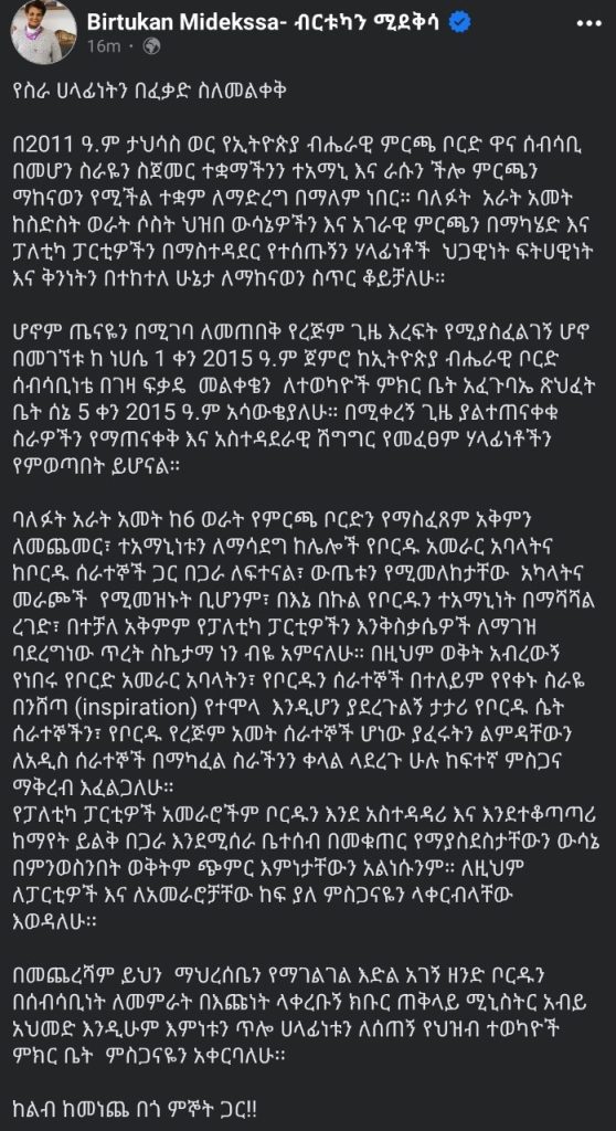 She asserted that, as of August 8, 2023, I had voluntarily resigned from my position as chairman of the Ethiopian National Board after informing the Speaker’s office of the House of Representatives on May 28, 2024 that she had health issues.